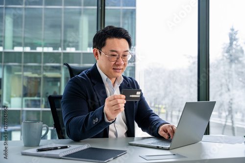 Confident Asian businessman focused on online transaction using laptop and credit card in a stylish office setting modern technology and productivity insights.