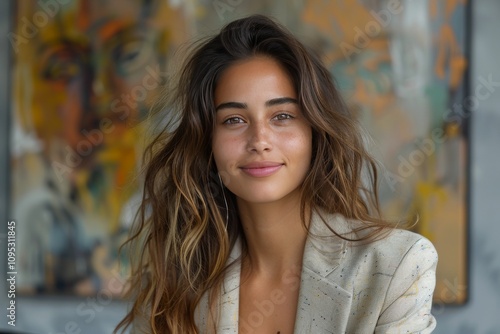 Confident Brunette Businesswoman Smiling in Office for Professional Portrait