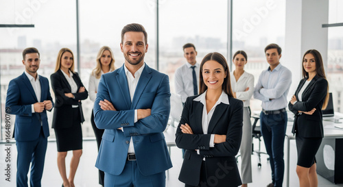 Confident business man and woman standing in front with their arms crossed while a diverse, professional team stands smiling behind them in a modern office setting