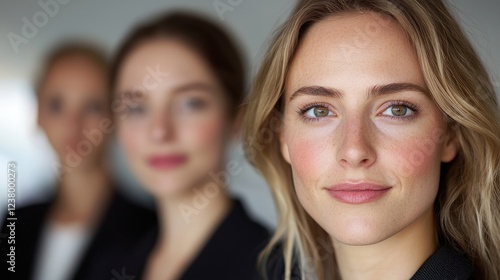 Confident businesswoman, colleagues blurred, office background, teamwork concept