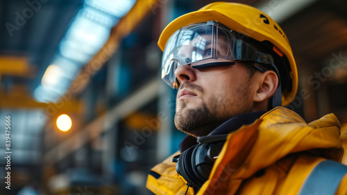 Confident Construction Worker in Safety Gear at Industrial Site, Wearing Helmet and Protective Glasses, Focused on Job, Modern Industrial Background, Professional Engineering and Construction