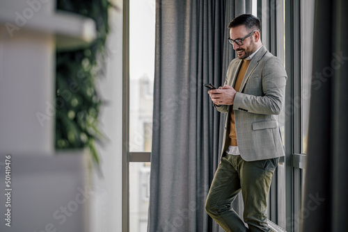 Confident happy businessman text messaging on cellphone while standing at office