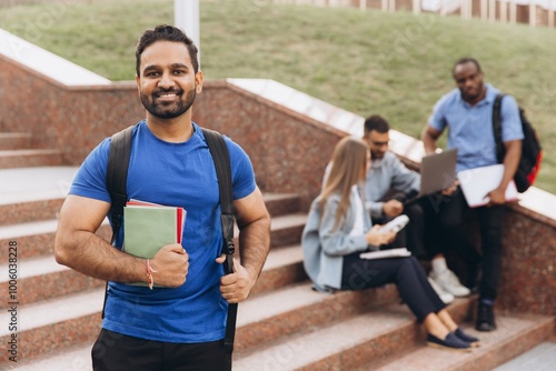 Confident Indian Student Standing with Books on Campus Steps with Group Study Session in Background