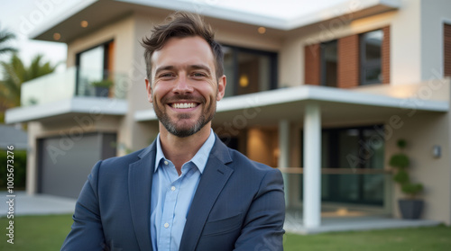 Confident Male Realtor Smiling in Front of Modern Luxury Home – Professional Real Estate Agent in Upscale Neighborhood