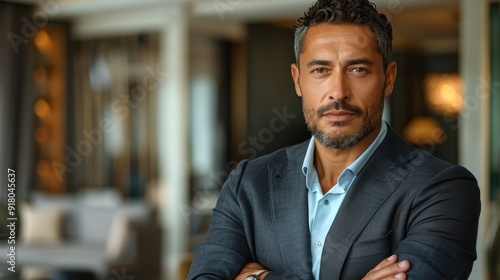 Confident man standing in a stylish lounge, showcasing modern elegance during daytime