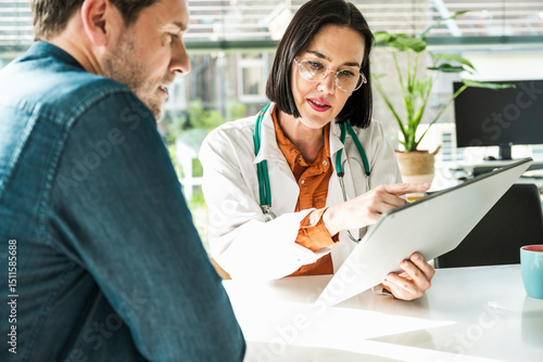 Confident mature female doctor discussing over tablet PC with patient in clinic