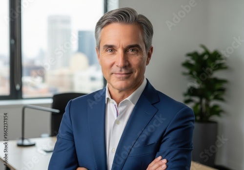 Confident middle aged businessman in blue suit smiling with arms crossed in modern office