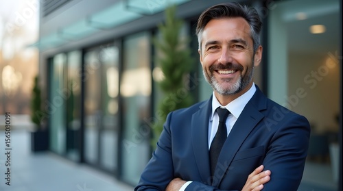Confident middle-aged Caucasian man in a suit, smiling outdoors by a modern building.