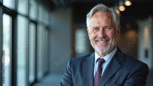 Confident Senior Executive Smiling Warmly Against Modern Office Background