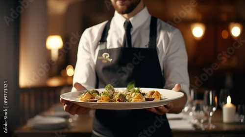 Confident waiter holding dish on hands at Restaurant background