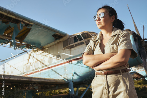 Confident woman by old plane
