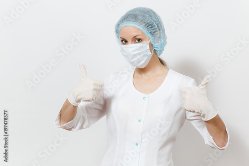 Confident young doctor woman with face mask, sterile hat, gloves isolated on white background. Female surgeon doctor in medical gown showing thumbs up. Healthcare personnel, health, medicine concept.