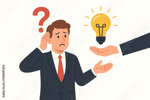 Confused businessman getting solution lightbulb idea help. Problem solving concept. Business consulting mentorship guidance support. Corporate innovation creative breakthrough assistance