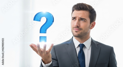 Confused businessman looks at question mark above hand, showing uncertainty. Question mark hovers as symbol of unanswered questions. Use this image for themes of uncertainty, confusion,
