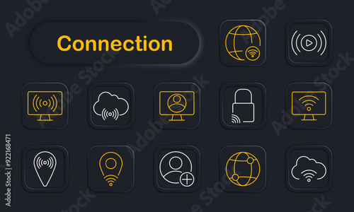 Connection set icon. Wi-Fi, cloud, laptop, monitor, security, user, location, wireless, signal, globe, settings, video, networking, upload, streaming.