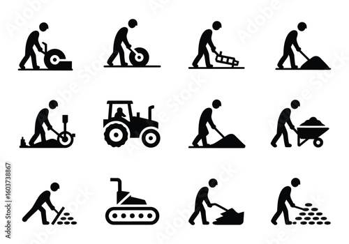 Construction and Agricultural Icons Collection Set of Silhouette Pictograms Representing Laborers Operating Machinery and Performing Manual Tasks in Various Work Environments