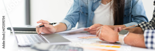 Construction business plan concept, Two architects discuss about project and house plan on laptop