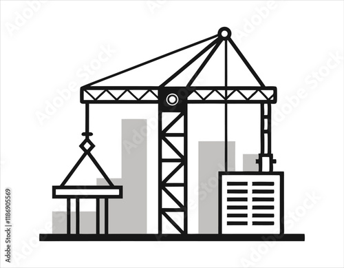 construction crane lifting materials at a building site with city skyline in the background, representing urban development and construction industry.