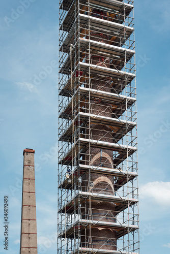 construction d'une cheminée industrielle en brique avec un échafaudage