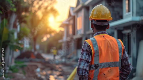 construction engineer standing with his back and watches at a house building construction.