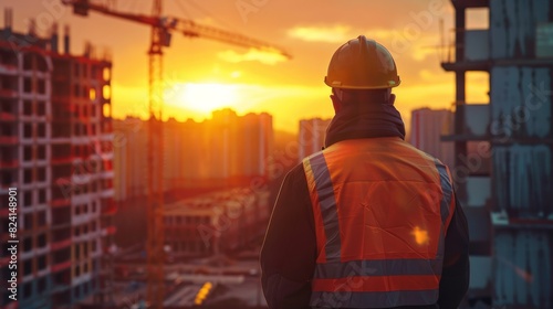 Construction engineer with safety standard looking at building at construction site with sunset. generative ai