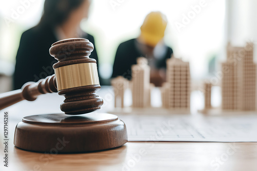 Construction law: Gavel on table with building plans. Symbolizes legal aspects in development. For real estate regulations, zoning laws, and contract disputes.