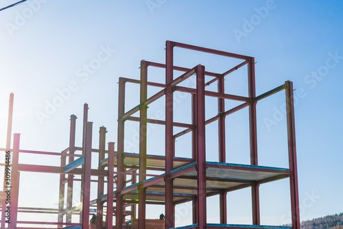 construction of the building of metal structures, metal frame roof. Steel design for the construction of the building against the sky.