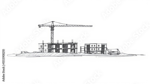 Construction site : A pencil sketch depicting a construction site in progress, capturing the essence of urban development with its towering crane and partially built structure.