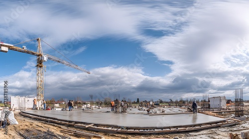 Construction site showing a fresh concrete slab being poured, with construction workers, a yellow crane extending across the frame, under a dynamic cloudy sky, and natural lighting with daylight...