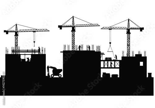 Construction site silhouette. A construction site with cranes, workers, and machinery in silhouette form, representing urban development and infrastructure. Vector clipart illustration design.