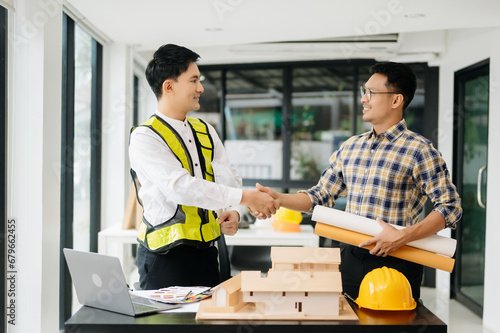Construction team shake hands greeting start new project plan behind yellow helmet on desk in office