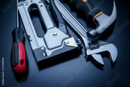 Construction tools on gray background