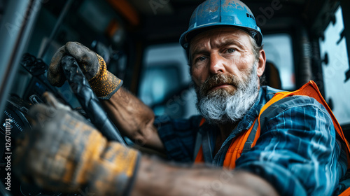 Construction Worker: A close-up portrait of a seasoned construction worker, clad in a safety helmet and work gloves, driving a heavy duty machinery.