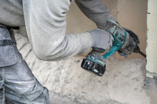 Construction worker destroying concrete wall.