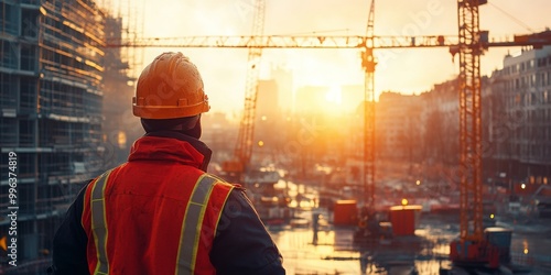 Construction worker directing crane, bright sunlight illuminating scene, soft blur of construction site in background, focused labor environment