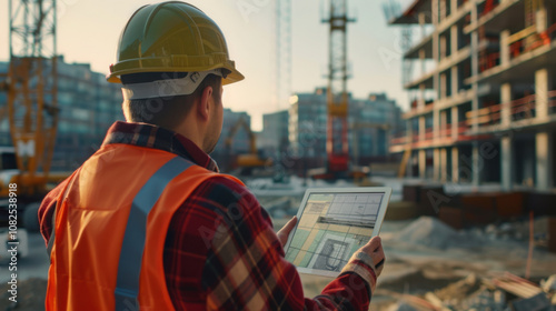 Construction worker engineer architect team at work on major construction site with computer tablet hardhat and safety vest.