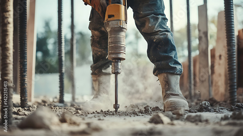 Construction Worker Using Jackhammer on Concrete