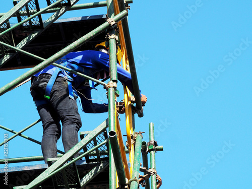 Construction workers working on scaffolding with blue sky at construction site