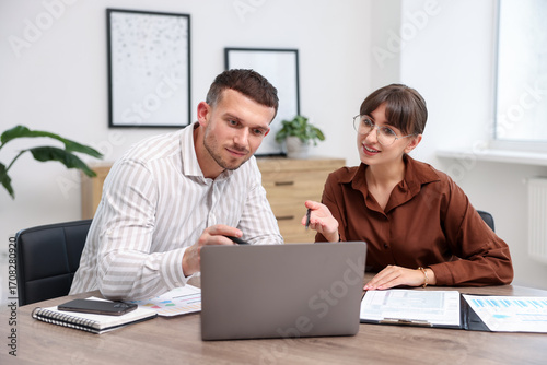 Consultant working with client at table in office. Business meeting