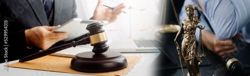 Consultation and conference of professional businesswoman and Male lawyers working and discussion having at law firm in office. Concepts of law, Judge gavel with scales of justice