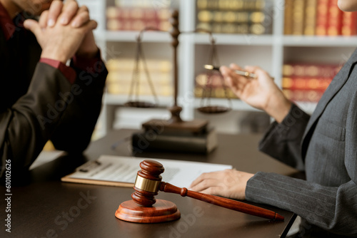 Consulting and finding a solution Concept, businesspeople consult with a lawyer or judge to find out about business fraud.