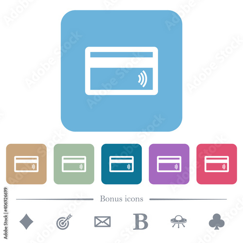 Contactless credit card flat icons on color rounded square backgrounds