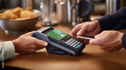 Contactless payment concept, customer holding credit card near nfc technology on counter, client make transaction pay bill. Created with Generative AI technology.