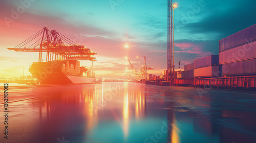 Container truck in ship port for business Logistics and transportation of Container Cargo ship and Cargo plane with working crane bridge in shipyard at sunrise, logistic import export and transport