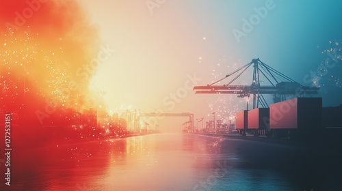 Container truck in ship port for business Logistics and transportation of Container Cargo ship and Cargo plane with working crane bridge in shipyard at sunrise, logistic import export and transport