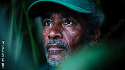 Contemplative portrait of elder man with grey beard and green cap, his gaze fixed upwards amidst vibrant, blurred tropical jungle