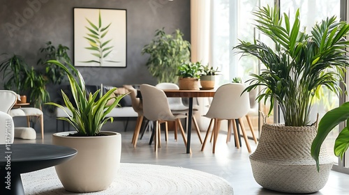 Contemporary neutral living space with stylish furniture decorative plants and soft natural lighting