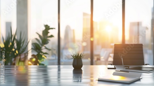 Contemporary Office Workspace with Morning Sunlight, Cityscape View for Professional Business Presentations