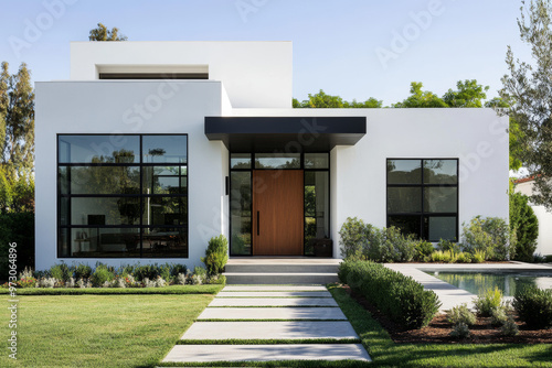 Contemporary white house featuring large black-framed glass windows, minimalist landscaping, and sleek architecture in a serene suburban setting.