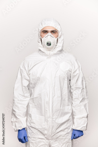 Contemporary young man in protective eyeglasses, blue gloves, mask and coveralls